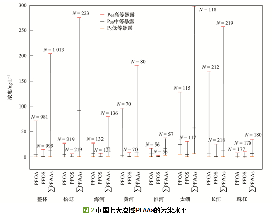 中等暴露水平下, 七大流域整體ΣPFAAs的P50濃度水平為14 ng·L-1(圖 2), PFOA、PFBA和PFOS為主要污染物. PFCAs占ΣPFAAs的83%, 碳鏈≤8的化合物占ΣPFAAs的92%.七大流域中, 黃河、珠江流域ΣPFAAs濃度分別為9.9 ng·L-1、7.1 ng·L-1, 低于整體水平; 海河、淮河、長江流域分別為18、17、14 ng·L-1, 與整體水平相當; 松遼、太湖流域分別為92 ng·L-1、57 ng·L-1, 污染程度遠高于整體水平.其中, 太湖流域PFOA、PFOS濃度分別為25 ng·L-1、5.1 ng·L-1, 是七大流域整體水平(PFOA:5.6 ng·L-1; PFOS:1.2 ng·L-1)的4.5和4.3倍, 其P5低等暴露水平下ΣPFAAs濃度(7.5 ng·L-1)高達七大流域整體水平(0.68 ng·L-1)的11倍, 表明太湖流域PFAAs本底較高.太湖流域在七大流域中面積最小, 僅是黃河流域的二十分之一, 但人口密度為全國平均值的7倍, 是我國人口最集中的地區之一.作為我國最大的綜合工業基地, 涉氟行業如電子、機械、化工、冶金、紡織和食品等占太湖流域工業總產值的比例高達85%, 應是該流域水資源PFAAs含量較高的原因.而松遼流域受氣候影響較大, 降水量為七大流域最小, 水資源儲量呈逐年減少趨勢, 水質污染問題較嚴重.據文獻的報道, 該流域水質隨著水資源管理制度的實施正逐年改善.
