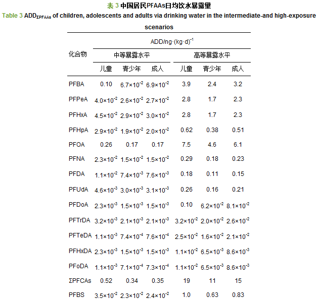 表 3列出了中、高等暴露水平下中國居民飲水的ADDΣPFAAs值.中等暴露水平下, 成人、青少年、兒童飲水的ADDΣPFAAs分別為0.42、0.41和0.63 ng·(kg·d)-1, PFOA、PFBA、PFOS之和占ADDΣPFAAs的66%.高等暴露水平下, 成人、青少年、兒童的ADDΣPFAAs分別為18、13、22 ng·(kg·d)-1, 是中等暴露水平的32~42倍, 碳鏈≤6的PFCAs攝入比例有所增加.各年齡段均未見性別間顯著性差異.隨著年齡增長, 體重(BW)增加遠大于飲水量(IR)增加, 故IR/BW及ADDΣPFAAs值均應呈下降趨勢.但在中、高等暴露水平下, 青少年飲水ADDΣPFAAs值低于成人, 表明我國青少年飲水量普遍低于建議量, 與文獻的報道相符.