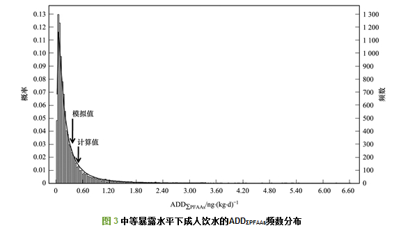 中等暴露水平下, 成人ADDΣPFAAs計算值[0.42 ng·(kg·d)-1]與蒙卡模擬值[0.35 ng·(kg·d)-1]的相對偏差為20%(圖 3), 同時, 其RPFOA(5.1×10-10)、RPFOS(1.5×10-9)與模擬值(RPFOA:4.6×10-10; RPFOS:1.6×10-9)的相對偏差分別為11%和6.3%, 顯示模型計算結果在可接受水平.七大流域覆蓋面廣, 數據群的標準偏差較大, 以及數據源文獻中目標化合物數量、檢測分析方法及其檢測限存在差異是產生偏差的主要原因.