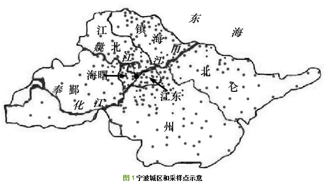 寧波地處長江三角洲南翼, 交通便捷、經(jīng)濟(jì)發(fā)達(dá), 是典型的華東沿海城市.市內(nèi)設(shè)有鎮(zhèn)海(ZH)、北侖(BL)、江北(JB)、江東(JD)、海曙(HS)和鄞州(YZ)這6個行政區(qū)(如圖 1), 每個區(qū)功能各異, 特征明顯.鎮(zhèn)海區(qū)是重工業(yè)區(qū), 區(qū)內(nèi)有大型煉油廠和與其配套的化工園區(qū)、金屬加工廠等; 北侖區(qū)是港口工業(yè)區(qū), 區(qū)內(nèi)有世界第一大港口(北侖港), 還有大型的熱電廠、電鍍廠等; 江北和江東區(qū)是工業(yè)和商業(yè)混合區(qū), 也是老城區(qū), 工業(yè)類型混雜, 人口較多; 海曙區(qū)是中心城區(qū), 商業(yè)盛行、工業(yè)極少, 交通繁忙、人口密集, 三大主干河流也在此區(qū)匯合; 鄞州區(qū)是新興工業(yè)和人文混合區(qū), 區(qū)內(nèi)產(chǎn)業(yè)類型較多, 人口密度較小.