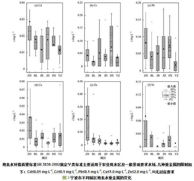 重金屬因不降解、持續(xù)性和生物積累性, 對人體健康存在潛在危害, 可通過直接接觸或食物鏈富集到人體, 嚴(yán)重?fù)p害肝、腎、消化系統(tǒng)和神經(jīng)系統(tǒng), Cd和Cr等一些重金屬還有致癌性, 是一類危害重大的水污染物.本文以寧波為例, 對我國華東沿海城市地表水中6種重金屬(Cd、Cr、Pb、Zn、Cu和Ni)的污染現(xiàn)狀開展了廣譜性調(diào)研和分析, 評價了6種重金屬的健康風(fēng)險和Cd、Cr的致癌風(fēng)險, 以期為華東沿海城市地表水和東海近岸海域重金屬污染的治理提供依據(jù).