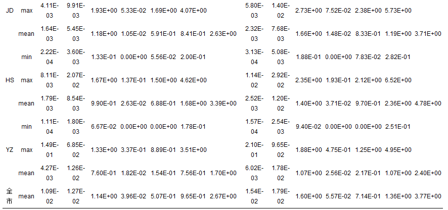 式中, RfD為口服毒性物質(zhì)的劑量, 6種重金屬的RfD分別為:Cd 0.000 5 mg·(kg·d)-1, Cr 0.001 5 mg·(kg·d)-1, Cu 0.037 mg·(kg·d)-1, Ni 0.02 mg·(kg·d)-1, Pb 0.003 6 mg·(kg·d)-1, Zn 0.3 mg·(kg·d)-1.