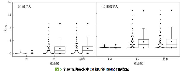 綜合可見, 寧波城區(qū)70%以上地表水中的重金屬污染對人類存在潛在健康風(fēng)險, 風(fēng)險指數(shù)最大的3種重金屬及順序?yàn)椋篊d>Cr>Pb, 風(fēng)險最高的區(qū)域?yàn)殒?zhèn)海區(qū)和海曙區(qū), 地表水重金屬對未成年人的健康風(fēng)險高于成年人.