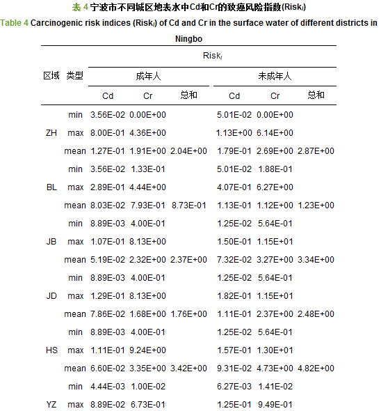 在所檢測的6種重金屬中, Cd和Cr具有致癌效應(yīng), 圖 5為重金屬對成年人和未成年人的Riski, 表 4列出了寧波市不同城區(qū)地表水重金屬Riski的最大值、最小值和平均值.從中可以看出, 不管是對成年人還是未成年人, 所有斷面Riski均遠(yuǎn)大于癌癥風(fēng)險臨界值1×10-4.對于成年人和未成年人, Cd和Cr者之和的Riski平均值分別為1.76和2.48, 分別達(dá)臨界值的17 600倍和24 800倍, 且95%以上的致癌風(fēng)險均因Cr引起.