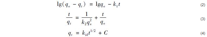 式中, k1(min-1)、k2(min-1)和kid[mg ·(g ·h0.5)-1]分別是準一級動力學、準二級動力學和顆粒內擴散模型的吸附速率常數; qe(mg ·g-1)和qt(mg ·g-1)分別為平衡吸附容量和在t(h)時間的吸附量; C(mg ·g-1)為與吸附劑表面特性有關的常數.