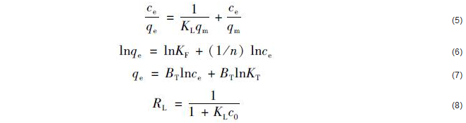 式中, KL(L ·mg-1)、KF [mg(1-1/n) ·L1/n ·g-1]、BT和KT(L ·mol-1)分別是Langmuir、Freundlich和Temkin模型中和吸附有關的常數; n是Freundlich吸附指數, 與吸附劑的性質有關; RL為Langmuir的平衡常數; c0(mg ·L-1)為污染物初始濃度;qm(mg ·g-1)為單層飽和吸附量.