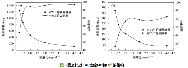 研究固液比對MB和Cu2+的吸附量和去除率的影響時, 采用25℃, MB和Cu2+初始濃度分別為500 mg ·L-1、200 mg ·L-1, 固液比分別為0.25、0.5、1、2、4 g ·L-1的條件, 實驗結果如圖 3所示.可見, CAP對MB和Cu2+的吸附量均隨固液比的增大而減小, 單位面積上的吸附位點利用率隨之降低. CAP對MB和Cu2+的去除率均隨固液比的增大而增大, 最終基本保持不變, 固液比大于1g ·L-1時, MB去除率可達94%, Cu2+去除率可達77%.后續實驗固液比選為1 g ·L-1.