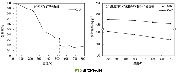 CAP的TGA曲線如圖 5(a)所示.在溫度范圍為0~100℃時, 水凝膠隨著溫度的升高, 有略微的失重, 是由于失去了間隙水.溫度在200~500℃時有明顯的失重, 且失重速率明顯大于之前, 此階段的失重是由于海藻酸鈉/聚乙烯醇的分解造成.可以看出, CAP在100℃以下具有較好的穩定性, 尤其是在25~40℃基本沒有失重, 具有很好的穩定性.不同反應溫度對CAP吸附MB和Cu2+的影響見圖 5(b). CAP水凝膠對MB和Cu2+的吸附量隨著溫度的升高而降低.當溫度達到60℃(333K)時, MB和Cu2+的吸附量分別為455.12 mg ·g-1和118 mg ·g-1, 升溫對MB吸附量的影響較小, 對Cu2+的影響較大.升溫不利于吸附的進行, 說明CAP對MB和Cu2+的吸附是放熱過程.熱力學擬合參數如表 1所示. ΔGθ為負值, 說明吸附過程是自發的; 焓變ΔHθ為負值, 證明吸附過程為放熱過程.有研究認為, 當焓變在2.1~20.9 kJ ·mol-1時吸附作用主要為物理吸附, 當焓變在20.9~418.4 kJ ·mol-1時吸附作用主要為化學吸附.本研究中CAP對亞甲基藍和銅離子的焓變值分別為-14.71 kJ ·mol-1和-20.10 kJ ·mol-1, 更加接近分界值, 推斷CAP吸附過程兼有物理吸附和化學吸附; 熵變ΔSθ為負值, 說明CAP對污染物的吸附使得吸附質分子的自由度減少, 吸附過程熵減少.