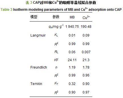 CAP對MB和Cu2+的吸附等溫線模型如圖 7所示, 擬合參數如表 3所示. Langmuir和Freundlich均能較好地擬合吸附等溫線, Temkin模型擬合效果較差.從表 2中看出, Langmuir模型具有最好的擬合效果, 說明CAP對MB和Cu2+的吸附符合Langmuir型, 是單分子層吸附.此外, 可通過擬合參數計算出RL均介于0~1, 表明吸附是易于進行的.由Freundlich擬合得到的n均大于1, 屬于優惠吸附, 分配系數KF與吸附劑的吸附能力有關, 其值越大, 說明CAP的吸附能力越強.由Langmuir型可得出CAP對MB、Cu2+的吸附量分別為1 940.75 mg ·g-1和190.48 mg ·g-1.