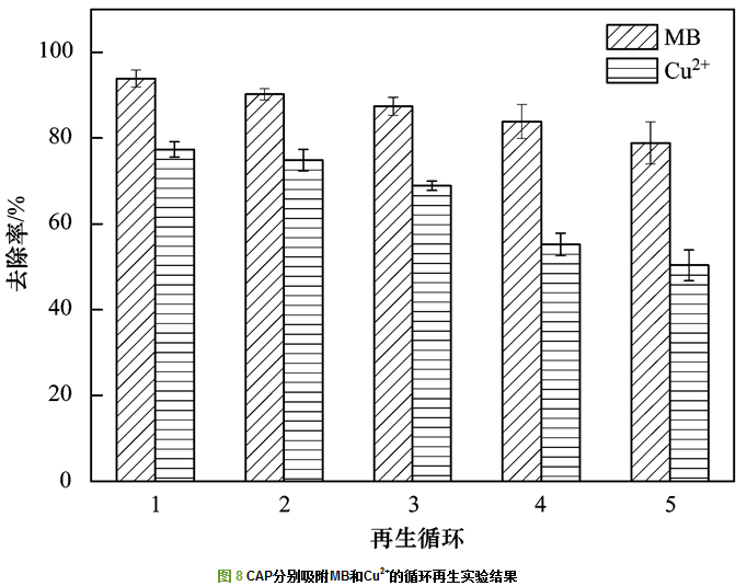 吸附劑除了是否具有優良的吸附性能外, 能否循環再生利用也是一個重要的考慮的因素.本實驗采用0.05 mol ·L-1 HCl溶液進行脫附.圖 8為CAP對MB和Cu2+吸附-脫附5次后的吸附效果.從中可知, CAP對MB和Cu2+的去除率均隨著吸附-脫附循環次數的增多而有所降低, 但是經過5次循環再生后仍然具有相當高的吸附能力, 因此是一種具有可回收利用潛力的吸附劑.