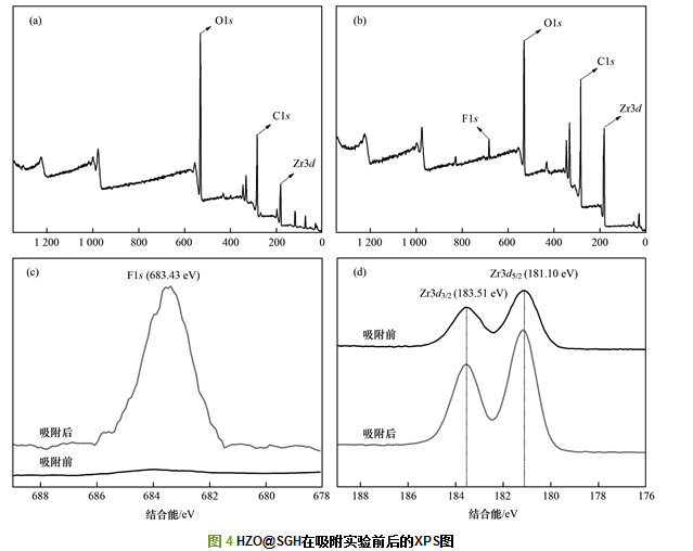 XPS表征可用來探究HZO@SGH吸附劑表面元素組成在吸附實驗前后的變化, 表征結果如圖 4所示.比較圖 4(a)和4(b)可發現HZO@SGH未吸附氟離子之前的全譜圖未發現F1s峰, 而HZO@SGH吸附氟離子后出現了一個較強的F1s峰, 這說明了HZO@SGH能夠成功吸附溶液中的氟離子, 圖 4(d)氟的XPS分譜圖中F1s的結合能在吸附實驗前后的改變也證實了這點.溶液中氟離子在HZO@SGH上的吸附機制可大致由圖 4(c)解釋, 在吸附實驗前, 鋯的XPS分譜圖在181.10 eV和183.51 eV處出現了兩個峰, 分別對應于Zr3d5/2和Zr3d3/2, 而在吸附氟離子之后, Zr3d5/2和Zr3d3/2都向左發生了0.21 eV和0.13 eV的化學位移, 這是由于吸附劑表面的鋯與溶液中電負性更強的氟離子相結合而形成氟化鋯或鋯的氟氧化物, 使得鋯的電負性增強, 導致其外層電子密度減小, 對內層電子的屏蔽作用相應減弱, 因此鋯的內層電子結合能增加, 所以Zr3d5/2和Zr3d3/2發生了化學位移.