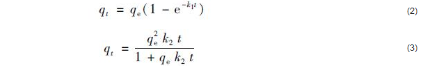 式中, t(min)為吸附質與吸附劑的接觸時間; qt(mg ·g-1)為t時刻的吸附量; qe(mg ·g-1)表示平衡吸附量; k1 (min-1)為擬一級動力學常數; k2 [g ·(mg ·min)-1]為擬二級動力學常數.