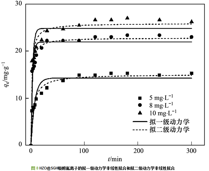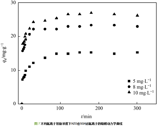 吸附動力學研究是一種探究吸附過程的重要方法.在25℃, pH=6.5, 不同氟離子初始濃度(5、8和10 mg ·L-1)條件下, HZO@SGH去除氟離子的吸附動力學曲線如圖 7所示, HZO@SGH對氟離子的吸附量隨著溶液中氟離子初始濃度增加而增大, 在吸附前30 min, 吸附速率較快, 隨后吸附速率逐漸減小, 在300 min基本達到吸附平衡.