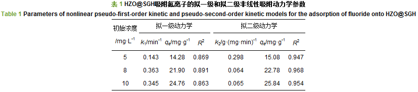 利用擬一級動力學方程和擬二級動力學方程對HZO@SGH吸附氟離子進行擬合, 擬合結果如圖 8所示, 擬合參數見表 1.從中可看出, 擬二級動力學相關系數(R2>0.968)均高于擬一級動力學相關系數, 表明氟離子在HZO@SGH上的吸附動力學更符合擬二級動力學模型, 這說明吸附速率主要是由HZO@SGH與氟離子間的配位交換和靜電吸引相關的化學吸附控制.