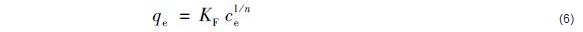 Freundlich吸附等溫方程是一種基于假設吸附劑表面是非均一的經驗方程, 其非線性形式可由式(6)表示: