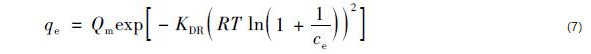 Dubinin-Radushkevich等溫模型常用于描述多孔材料的吸附過程和機制, 可由式(7)表示: