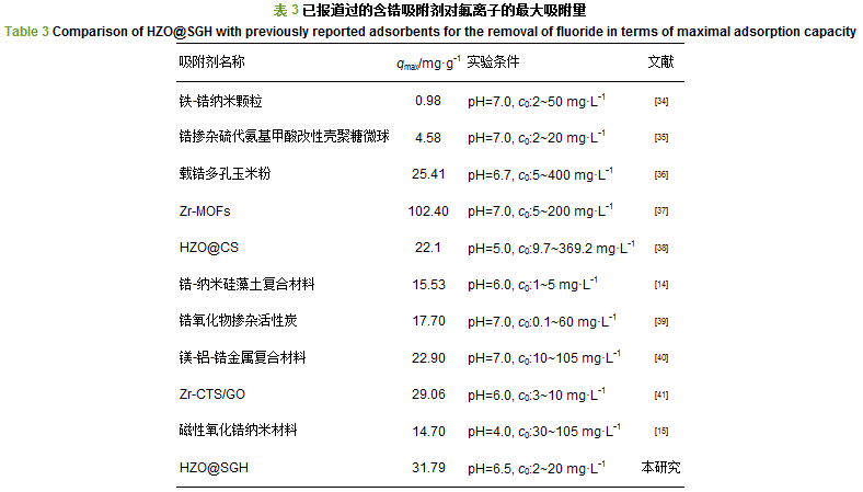 表 3為前人所報道過的含鋯復合吸附劑和本研究所制備的HZO@SGH對溶液中氟離子最大吸附量的對比.本研究通過可控的均相沉淀法制備的HZO@SGH, 能夠使HZO均勻地涂蓋到SGH表面, 既避免了HZO團聚的產生而使其活性位點減少, 又保持了石墨烯大比表面積的特點, 所以由表 3可看出本研究所制備的HZO@SGH較部分含鋯復合吸附劑有更優異的吸附性能.