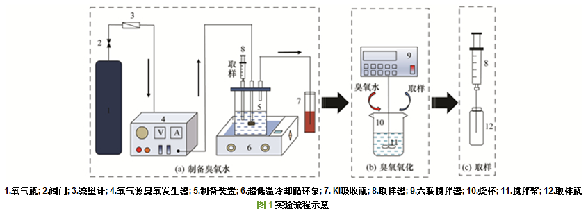 水樣來自西安市某污水處理廠A2/O工藝的二沉池出水, 該污水處理廠進水主要來自城市生活污水.采用圖 1(a)所示裝置制備臭氧原液, 制備裝置中加入適量超純水, 用磷酸調pH至3.氧氣源臭氧發生器(濟南三康, SK-CFQ-5P)出口流量通過氣體流量計控制在20 L ·h-1, 溢出的氣體通入KI吸收瓶.制備時溫度通過水浴控制在0~4℃之間, 曝氣約2 h后使用紫外分光光度計(UNIC, UV-4802)在波長258 nm下測定吸光度值[ε258=3 000 L ·(mol ·cm)-1], 其濃度可達到80 mg ·L-1.