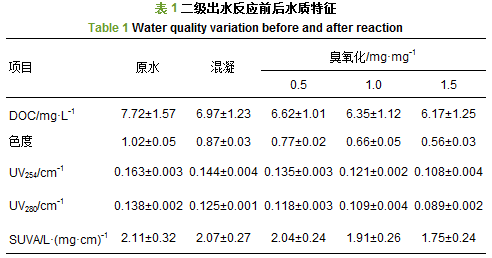 因此, 本研究將污水廠二級出水先經過混凝處理, 混凝之后的水再經過臭氧化處理后, 分析水中有機物色度、DOC、UV254和SUVA等的變化情況, 并進一步討論不同處理方式和不同臭氧投加量對難凝聚有機物相對分子質量、熒光特性和官能團種類的影響.