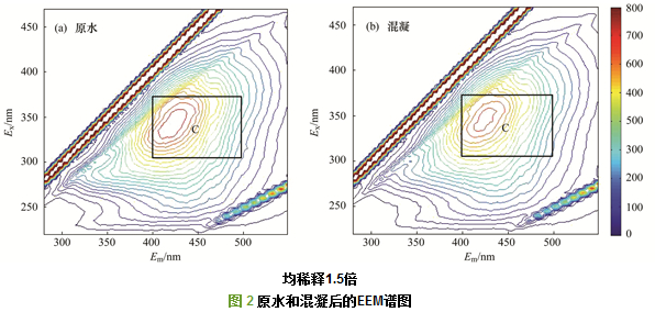 采用日本JASCO公司生產的FP6500型熒光分光光度計進行分析, 原水和混凝后的二級出水均稀釋1.5倍測定.激發波長范圍為220~480 nm, 發射波長范圍為280~550 nm.激發和發射掃描間隔分別為5 nm和2 nm, 掃描速度為2 000 nm ·min-1.測定前使用空白溶液校準, 排除水的散射峰影響.