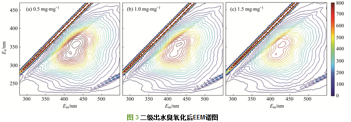三維熒光光譜能夠揭示多組分復雜體系中有機污染物種類及含量等信息, 具有準確度高、靈敏度高、所需樣品少等優點, 也被稱為“熒光指紋”.本實驗采用三維熒光光譜法對原水及臭氧化前后二級出水的熒光特性進行表征, 結果如圖 2和圖 3所示.原水熒光譜圖中含有明顯的熒光峰Ex/Em=350/440 nm(峰C), 根據已有的研究表明該處熒光峰表示腐殖質類物質.經過混凝后峰C的熒光強度減弱了4.7%, 但位置沒有發生變化.