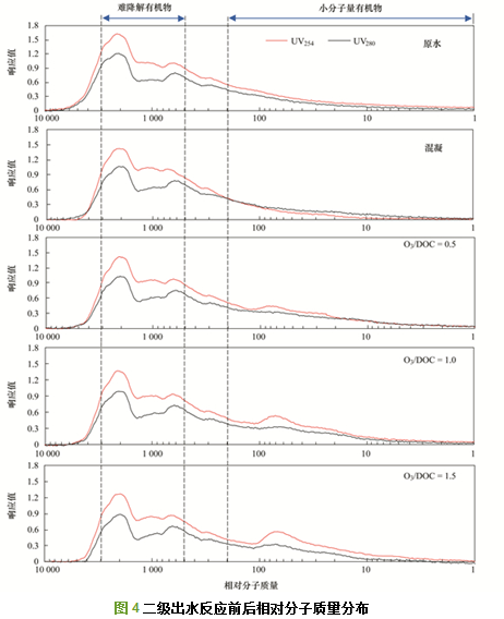 經過臭氧化后, 一方面難凝聚有機物紫外吸收峰強度減弱更加明顯, 另一方面相對分子量位于100處出現一個明顯的紫外吸收峰, 且隨著臭氧投加量的增加, 該處吸收峰強度逐漸增加, 說明臭氧能夠將大分子有機物氧化分解為小分子有機物, 但難以將其完全氧化為CO2和H2O, 只是生成了一些中間物質, 這也是臭氧化后DOC降低不明顯的原因.