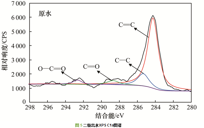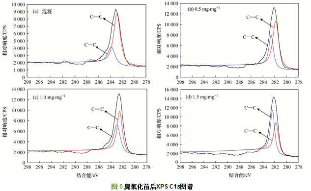 利用X射線光電子能譜(英國熱電, K-α)探究二級出水經混凝和臭氧化處理后的碳元素價鍵形式. XPS分析前, 需將樣品放置在冷凍干燥機(北京博益康, FD-1C-50)中干燥成粉末后進行測定.實驗得到的元素電子結合能以C1s(285 eV)進行校正. C1s譜圖應用XPSPEAK41專業軟件進行高斯分峰擬合, 對不同形態的碳原子進行定量分析.