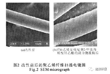 近些年,很多研究者集中于研究螯合纖維,因為螯合纖維可用于分離水溶液中的重金屬離子。又由于相對于其他的吸附劑,螯合纖維具有很高的選擇性和很大的吸附容量以及易于再生等特點而備受關注,這些特點都歸于吸附劑比表面積大、吸附動力高、合適的功能基團的引進以及聚合纖維費用低等口制。Mustafa等研究了將4一乙烯基吡啶和2一甲基丙烯酸羥乙酯單體的混合物接枝到聚乙烯(對苯二甲酸亞乙酯)纖維上以去除水溶液中的Cr(Ⅵ)、Cu(Ⅱ)和Cd(1I)等重金屬離子。觀察發(fā)現(xiàn),改性后的纖維穩(wěn)定性好,再生能力強且活性不會降低。通過掃描電鏡發(fā)現(xiàn)如圖2所示