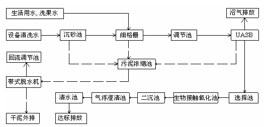 根據(jù)此果汁廠廢水的水質(zhì)水量特點(diǎn)和廢水處理工藝的特點(diǎn),故選用UASB+接觸氧化工藝+氣浮處理工藝對(duì)廢水進(jìn)行處理,處理工藝流程如下圖。