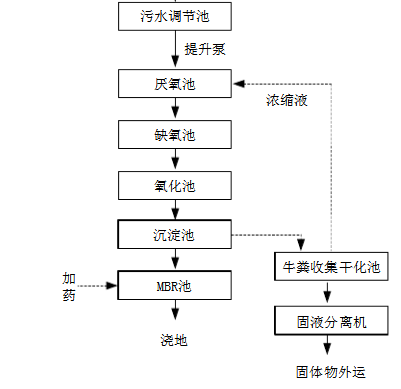 根據以上分析,擬定“固液干化分離+厭氧+缺氧+氧化池+沉淀+儲存(MBR處理循環)”作為污水處理工藝技術方案。本工藝有如下特點: