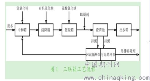 三聯(lián)箱技術(shù)作為國(guó)內(nèi)的脫硫廢水處理應(yīng)用最多的一種工藝技術(shù),包含“絮凝—沉淀—中和”,具體工藝流程如圖1所示。脫硫廢水經(jīng)加堿(氫氧化鈉或氫氧化鈣)中和后,再加入有機(jī)硫、硫酸氯化鐵等絮凝劑以及助凝劑等藥品將脫硫廢水中的懸浮物及重金屬沉淀去除。沉淀的污泥經(jīng)脫水處理后運(yùn)至渣場(chǎng)進(jìn)行綜合處理,處理出水則經(jīng)pH調(diào)節(jié)后進(jìn)行排放。三聯(lián)箱技術(shù)是國(guó)內(nèi)普遍采用的脫硫廢水處理工藝,廢水含固量大成為制約該工藝發(fā)展的重要因素,不僅導(dǎo)致設(shè)備故障率高,運(yùn)行穩(wěn)定性差,而且需要添加大量藥劑,增加運(yùn)行成本。