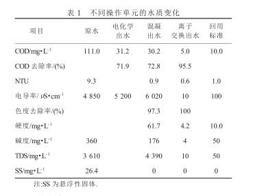 臺灣LINSH和CHENML采用電化學→混凝→離子交換的方法處理和回用經過二級處理的印染廢水.電化學和混凝去除色度、濁度(NTU)和化學需氧量(COD);離子交換是進一步降低廢水COD、Fe離子質量濃度、電導率和總硬度.不同操作單元的水質變化結果如表1所示.離子交換的主要作用是去除無機鹽,電導率、硬度、堿度、TDS去除率、出水水質好于回用標準。