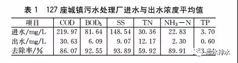 本研究共涉及127座污水處理廠,平均進水COD219.97mg/L,BOD581.64mg/L,SS148.54mg/L,TN為30.36mg/L,NH3-N為22.83mg/L,TP3.7mg/L,出水濃度均低于一級A標準,其中SS去除率最高,TN去除率最低,僅為59.92%。BOD5/COD平均值為0.36,BOD5/TN平均值為2.66,詳見表1。