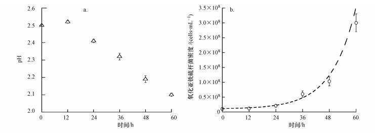 本研究所得施氏礦物顆粒相互團聚生長, 其形貌與前人報道結(jié)果(Liu et al., 2015b)基本一致.X射線衍射(XRD)技術(shù)不但可以鑒定礦物種類, 而且能夠區(qū)別晶型礦物與非晶型礦物.JCPDS(2002)PDF47-1775卡片數(shù)據(jù)及前人對施氏礦物X射線衍射(XRD)結(jié)果證實(Wang et al., 2013;Zhang et al., 2017), 施氏礦物XRD圖譜存在8條衍射寬峰, 其中, 典型寬峰位于2θ=26.26°、35.16°、55.30°與61.34°, 尤其是與2θ=35.16°處的特征寬峰常被用來作為鑒別施氏礦物的特征衍射峰.本研究所得次生鐵礦物XRD典型衍射寬峰位置與前人結(jié)果完全一致.結(jié)合本研究所得礦物SEM與XRD數(shù)據(jù), 可以證實體系獲得的次生鐵礦物為純施氏礦物.生物合成施氏礦物體系在0~60 h培養(yǎng)過程中, pH變化趨勢與氧化亞鐵硫桿菌生長趨勢見圖 2.從圖 2可以看出, 施氏礦物生物合成體系pH從初始的2.50逐漸降低至60 h時的2.10, 液相中微生物濃度從初始的1×107 cells·mL-1逐漸以指數(shù)增長趨勢增加至3×108 cells·mL-1.文獻報道氧化亞鐵硫桿菌氧化Fe2+的世代周期為6.5~15.0 h(周立祥, 2012).本研究在制備施氏礦物過程中, 氧化亞鐵硫桿菌利用Fe2+作為能源物質(zhì)共繁殖5代, 平均世代周期為12 h.