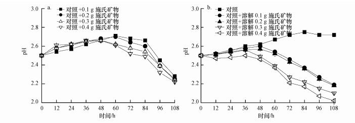 圖 3生物成因施氏礦物表面附著硫桿菌(a)與礦物溶解后游離硫桿菌(b)對Fe2+氧化體系pH變化的影響