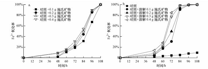 對照體系在108 h培養(yǎng)過程中, Fe2+氧化率逐漸從0升高至9.64%.小幅的Fe2+氧化消耗體系一定量的H+(Fe2++0.25 O2+H+→Fe3++0.5H2O), 致使體系pH升高(圖 3).當(dāng)對照體系加入0.1、0.2、0.3、0.4 g施氏礦物后, 體系Fe2+氧化率隨時間呈現(xiàn)明顯增加趨勢, 并且施氏礦物加入量越大, Fe2+氧化率增加幅度越大.雖然加入0.1~0.4 g施氏礦物體系Fe2+氧化率在108 h全部達到100%, 然而這并不能說明各處理氧化亞鐵硫桿菌Fe2+氧化能力是一致的, 僅是由于體系總的Fe2+濃度限制, 使得不同處理體系Fe2+在108 h實現(xiàn)完全氧化.在48~96 h培養(yǎng)過程中, 體系Fe2+氧化率均呈現(xiàn)出:對照+0.4 g施氏礦物>對照+0.3 g施氏礦物>對照+0.2 g施氏礦物>對照+0.1 g施氏礦物的變化趨勢.劉奮武等(2013a)同樣觀察到類似現(xiàn)象, 其發(fā)現(xiàn)當(dāng)體系初始氧化亞鐵硫桿菌密度從1.35×106 cells·mL-1增加至8.10×106 cells·mL-1時, 在改進型9K液體培養(yǎng)基生物氧化Fe2+時, 各處理在12、24、36 h的Fe2+氧化率隨著體系微生物數(shù)量增加而增加, 由于體系Fe2+濃度有限, 在第48 h各處理Fe2+均實現(xiàn)完全氧化.與添加施氏礦物引入的氧化亞鐵硫桿菌Fe2+氧化相比較, 施氏礦物溶解后釋放出的微生物進一步顯著加速了體系的Fe2+氧化進程.體系Fe2+氧化速率隨著溶解施氏礦物量的增加而增加, 且在第84 h, 所有施氏礦物溶解體系Fe2+氧化率全部達到90%以上.通過圖 4可以得出, 氧化亞鐵硫桿菌吸附包裹于施氏礦物后, 其對體系Fe2+氧化能力明顯減弱.例如, 0.1、0.2、0.3與0.4 g施氏礦物加入體系, 在第72 h, 體系Fe2+氧化率分別為19.0%、20.3%、24.2%與30.8%, 而當(dāng)0.1、0.2、0.3與0.4 g施氏礦物溶解加入體系后, 對應(yīng)時刻點體系Fe2+氧化率分別為30.8%、49.7%、77.1%與84.7%.究其原因可能是由于生物合成次生鐵礦物顆粒相互粘附生長, 被施氏礦物包裹的硫桿菌無法及時進入液相, 進而減緩體系Fe2+氧化進程.而施氏礦物溶解后, 所有微生物均成為游離態(tài), 加速體系Fe2+氧化.前人研究表明, Fe2+氧化過程產(chǎn)生的電子會傳遞到氧化亞鐵硫桿菌表面, 通過蛋白質(zhì)傳遞給細胞內(nèi)細胞色素C, 最終在部分酶的參與下, 最終將電子傳遞給氧氣(Rawlings, 2005).次生鐵礦物對氧化亞鐵硫桿菌的吸附包裹, 可能在一定程度上降低了電子向菌體表面的傳遞效率, 進而影響整個體系氧化還原反應(yīng)的發(fā)生, 降低Fe2+生物氧化效率.