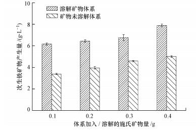 前期研究已經(jīng)表明, 氧化亞鐵硫桿菌接入改進型9K液體培養(yǎng)基中培養(yǎng), 體系合成的次生鐵礦物應(yīng)為施氏礦物與黃鐵礬的混合物(劉奮武等, 2013a;2015), 故在此并未對體系產(chǎn)生的次生鐵礦物進行進一步礦相分析.本研究對不同體系次生鐵礦物產(chǎn)生量給予關(guān)注, 結(jié)果如圖 5所示.