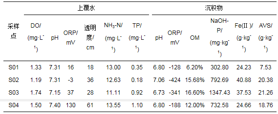 水和沉積物樣品的基本理化性質見表 1.由表中可見,所有樣點的DO濃度均低于2.0 mg · L-1,氨氮濃度均遠遠高于2.0 mg · L-1,屬于劣Ⅴ類水體.根據《城市黑臭水體整治工作指南》中劃定的城市黑臭水體污染程度分級標準,各樣點的DO和氨氮濃度均處于輕度黑臭級別.S01、S02、S03 3個樣點水體的ORP處于輕度黑臭級別,S01樣點的透明度處于輕度黑臭級別,其他樣點的透明度均高于輕度黑臭等級標準.鞋底沙河的S03、S04樣點TP濃度遠高于穗豐年河的TP濃度.