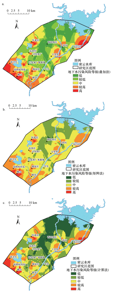 在同一地區(qū)對同一個數(shù)據(jù)使用不同的方法進(jìn)行分析, 所得到的地圖結(jié)果也會有所不同, 有時甚至?xí)嗷ッ?北京市地下水開采量占全市供水量的2/3左右, 是國際上為數(shù)不多的以地下水作為供水水源的大都市之一(郇環(huán)等, 2011).北京密懷順(密云-懷柔-順義)地區(qū)包括懷柔應(yīng)急水源地和水源八廠水源地, 主要為北京城區(qū)提供地下水資源, 開展更準(zhǔn)確的地下水污染風(fēng)險評價可為合理開發(fā)利用地下水資源和改善水質(zhì)提供科學(xué)依據(jù).故本文以北京密懷順地區(qū)作為示例, 選取3種最常用的地下水污染風(fēng)險評價方法(相加法、矩陣法和計算法), 通過硝酸鹽濃度分布進(jìn)行對比驗證, 旨在為研究區(qū)選取最優(yōu)的地下水污染風(fēng)險評價方法, 以便幫助決策者和管理者制定地下水保護(hù)的管理措施.