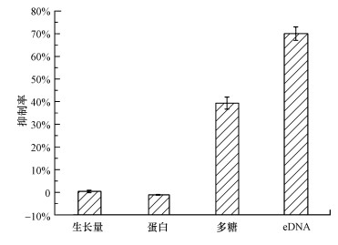 為了進一步探究雙(3-氨基丙基)胺對微生物的作用機制, 本研究進一步考察了雙(3-氨基丙基)胺對微生物生長及其EPS(胞外蛋白、多糖和DNA)的影響.結果如圖 6所示, 131 mg·L-1雙(3-氨基丙基)胺對微生物12 h生長量的抑制率為0.36%±0.54%, 沒有抑制微生物生長;對照組中胞外蛋白、多糖和eDNA的含量分別是(8.48±0.46) mg·g-1 MLVSS、(3.04±0.20) mg·g-1 MLVSS和(18.33±2.55) μg·g-1 MLVSS, 經過雙(3-氨基丙基)胺處理之后, 胞外多糖和eDNA均有下降, 分別為(1.85±0.08) mg·g-1 MLVSS, (5.49±0.54) μg·g-1 MLVSS, 下降了39.37%±2.68%和70.05%±2.93%, 而胞外蛋白含量幾乎沒有變化, 均保持在8.02~8.98 mg·g-1 MLVSS.本課題組進一步通過激光共聚焦觀察及定量計算顯示雙(3-氨基丙基)胺對生物膜處理后使多糖減少了53%(Wu et al., 2016).由此可以推斷雙(3-氨基丙基)胺對微生物附著及生物膜形成的抑制作用并不是通過殺菌產生, 對微生物EPS中胞外多糖和eDNA分泌有一定的抑制作用, 但對胞外蛋白沒有影響.