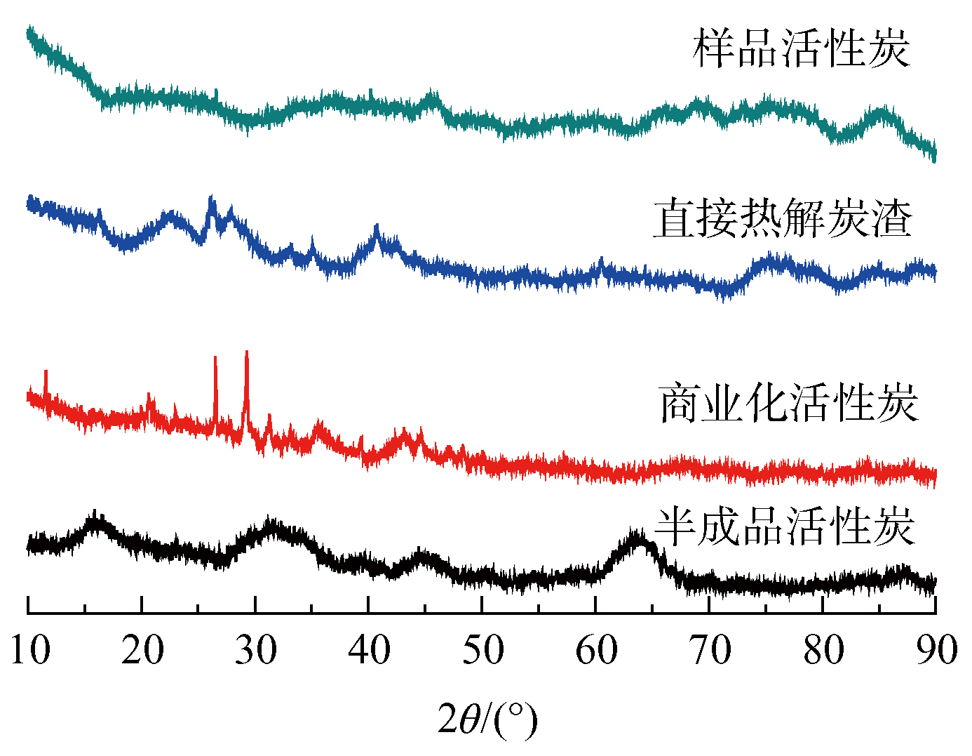 通過X射線衍射儀對污泥活性炭的晶體結構進行分析,實驗結果如圖2所示,商業化活性炭(CAC)在27°附近出現C的標準峰,而所制得的活性炭(AC-3)與半成品活性炭(CAPC)由于活化溫度的關系并沒有發生晶型的變化,依舊是無定形的形態,但是在直接熱解產生的炭渣(PC)中卻觀察到C以及Al2O3的峰。
