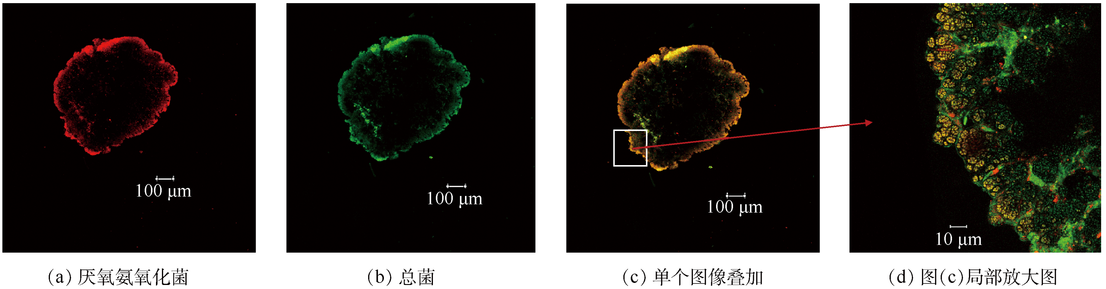 接種的厭氧氨氧化污泥熒光原位雜交照片如圖1所示。圖1中顯示紅色熒光信號(厭氧氨氧化菌)與綠色熒光信號(總細菌)的重合度較高,且顆粒污泥的熒光信號呈環形,外部熒光信號比內部強,這是因為受傳質阻力的影響,使得顆粒污泥外部基質濃度較高,顆粒內部基質不足而引起細胞自融所致。由局部放大圖(圖1(d))可見顆粒污泥微生物以微小的菌落群聚集分布,各群落間可能含有大量胞外聚合物,而胞外聚合物有利于污泥顆粒化。厭氧氨氧化菌的含量占總細菌含量的(90.39±4.76)%,說明接種污泥中厭氧氨氧化菌為優勢菌屬,接種該污泥有利于耦合實驗的進行。