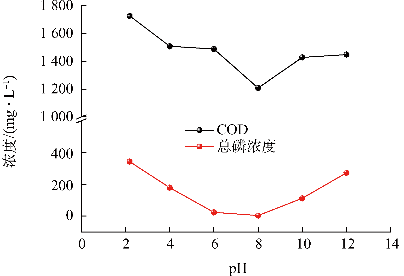 涂裝廢水中的總磷濃度、COD隨pH的變化情況如圖2所示。當pH從2.18增大到8時,隨著pH的升高,涂裝廢水中的總磷濃度迅速下降,在pH為8時總磷的去除率達到最高值98.89%,當pH繼續升高時,總磷濃度不降反升,當pH為10和12時,總磷去除率分別降低到67.27%和20.49%。