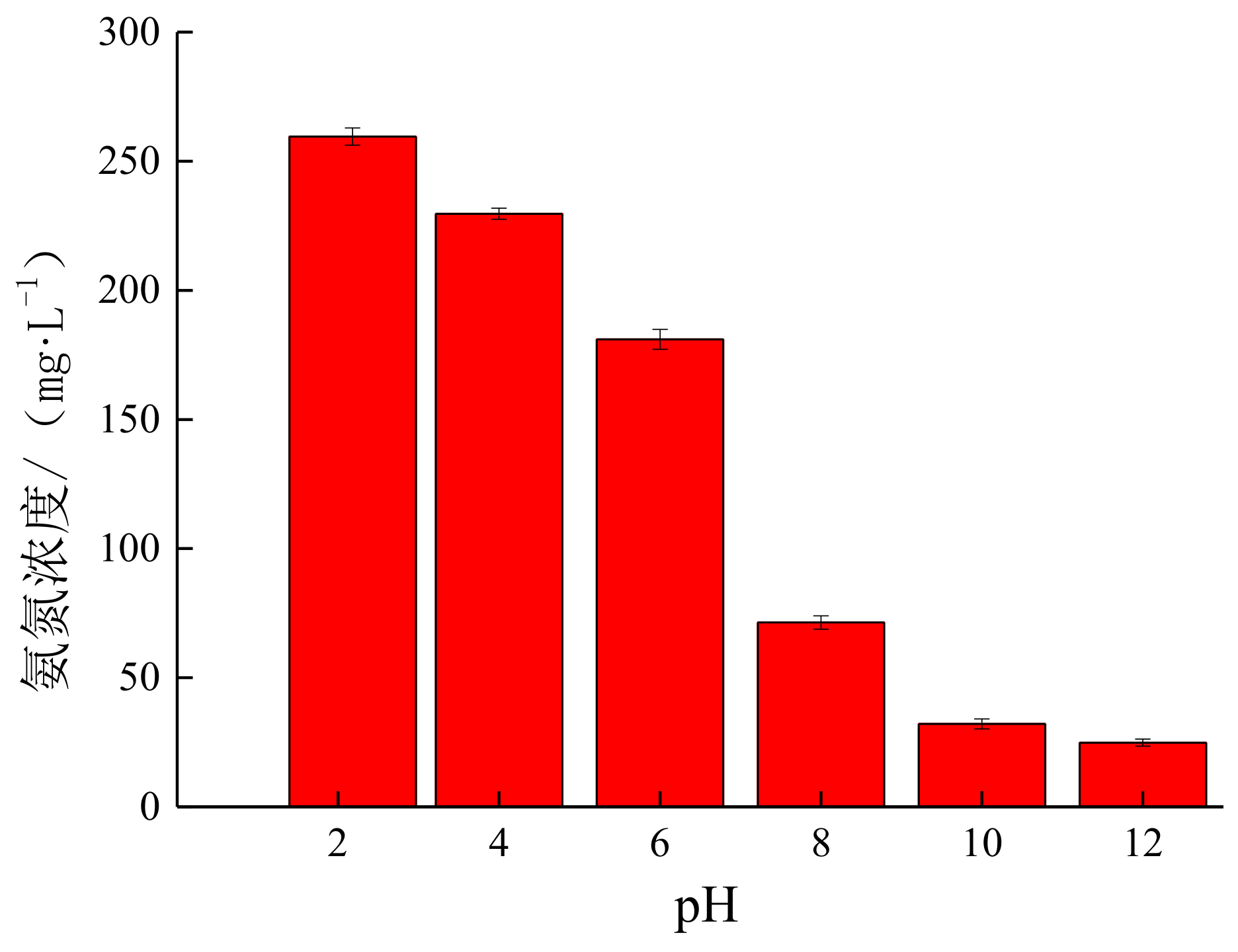 涂裝廢水中的氨氮濃度隨pH的變化情況如圖6所示。當pH從2.18增大到12時,隨著pH的升高,涂裝廢水中的氨氮濃度不斷下降,在pH=12時,氨氮去除率達到最高值90.42%。電中和、沉淀物吸附以及MgNH4PO4沉淀形成等是氨氮去除的主要原因。