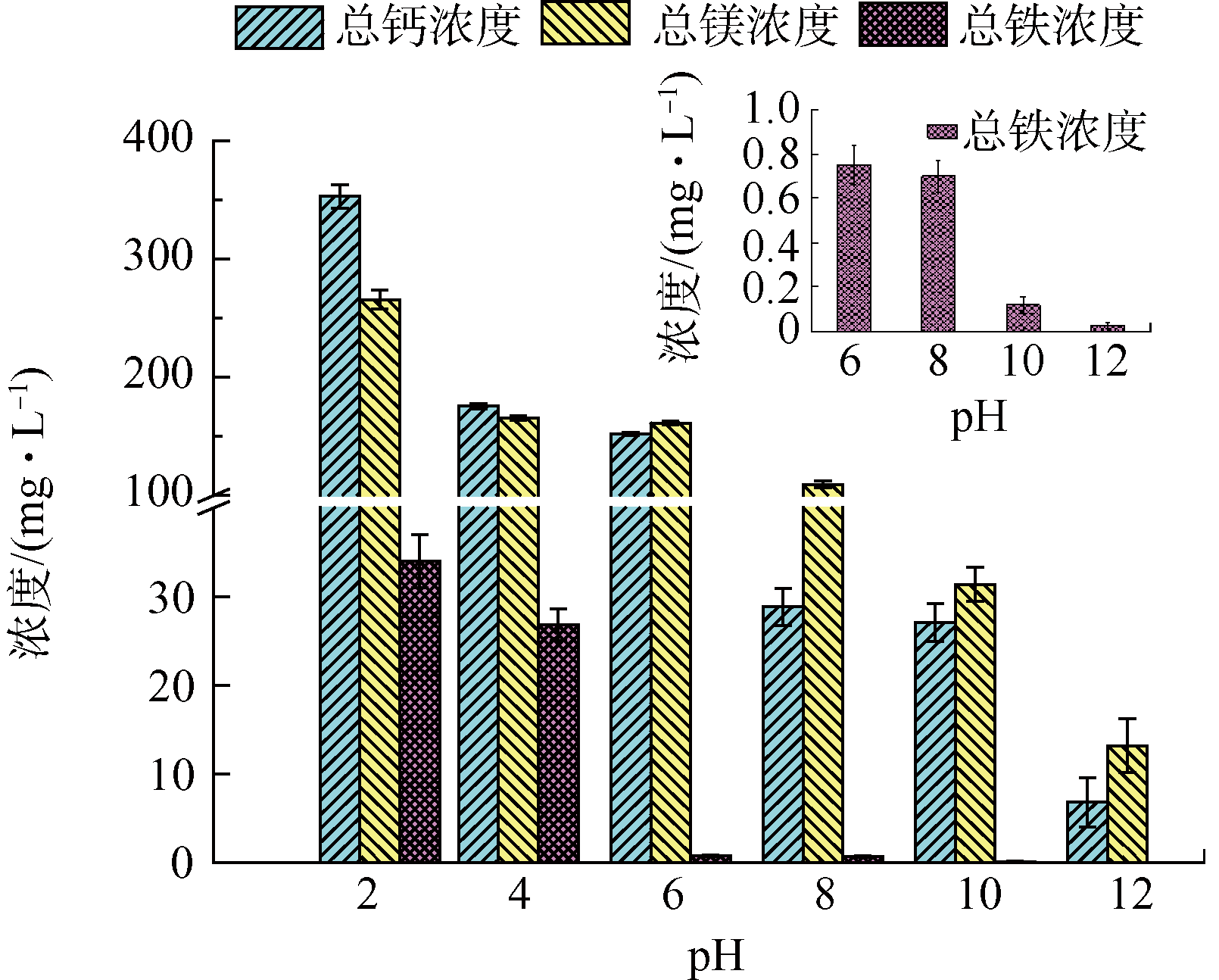 圖7 總鈣、總鎂、總鐵的濃度隨pH的變化