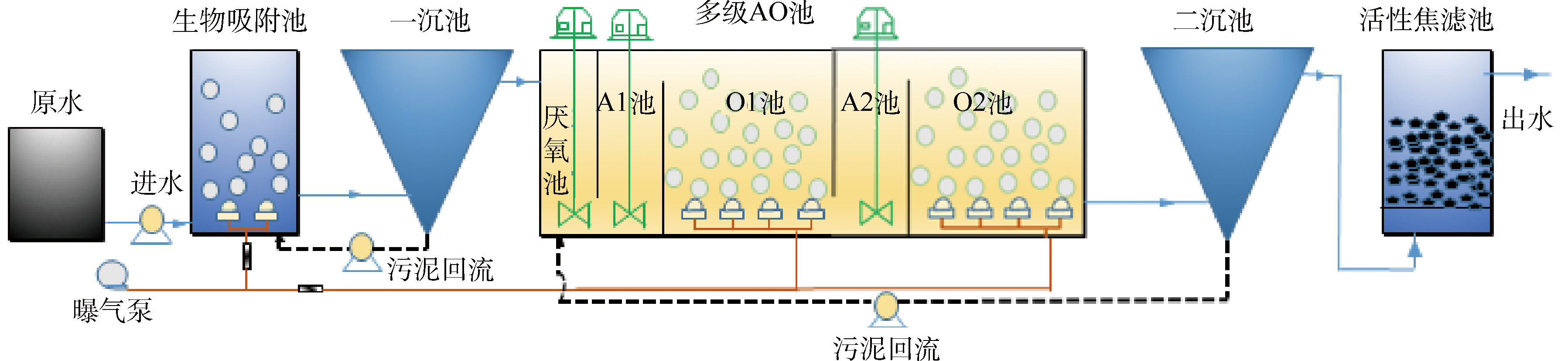 圖1 生物吸附-多級A/O-活性焦組合工藝流程