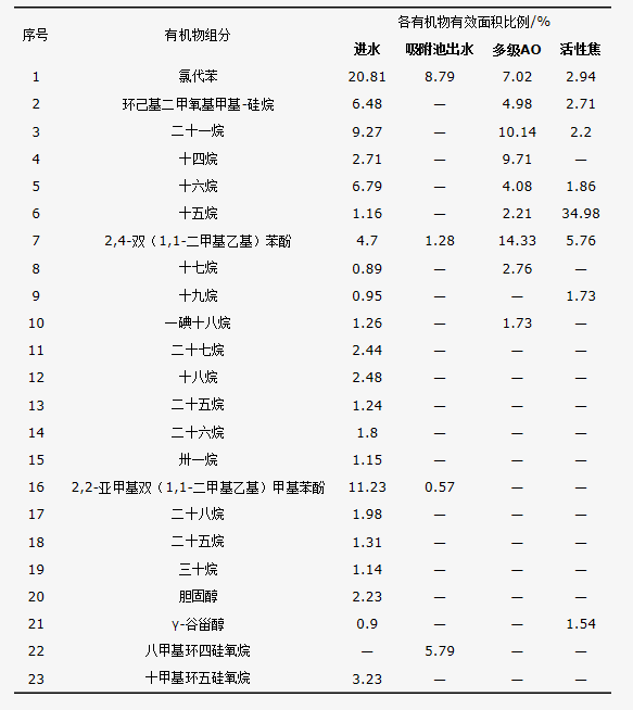 通過有機物組分變化分析(表2)發現,系統進水中含22種溶解性有機物,其中5種苯環類物質占總有機物含量30.79%,其余多為長鏈烷烴類物質,吸附池出水中主要為氯代苯、2,4-雙(1,1-二甲基乙基)苯酚、2,2-亞甲基雙(1,1-二甲基乙基)甲基苯酚、八甲基環四硅氧烷等4種物質,均為大分子、難生物降解的環烷類或含苯環的有機物,其中2,4-雙(1,1-二甲基乙基)苯酚、2,2-亞甲基雙(1,1-二甲基乙基)甲基苯酚由于在苯環上連接甲基和羥基(—OH)使其具有較強親水性,所以難以被吸附去除。