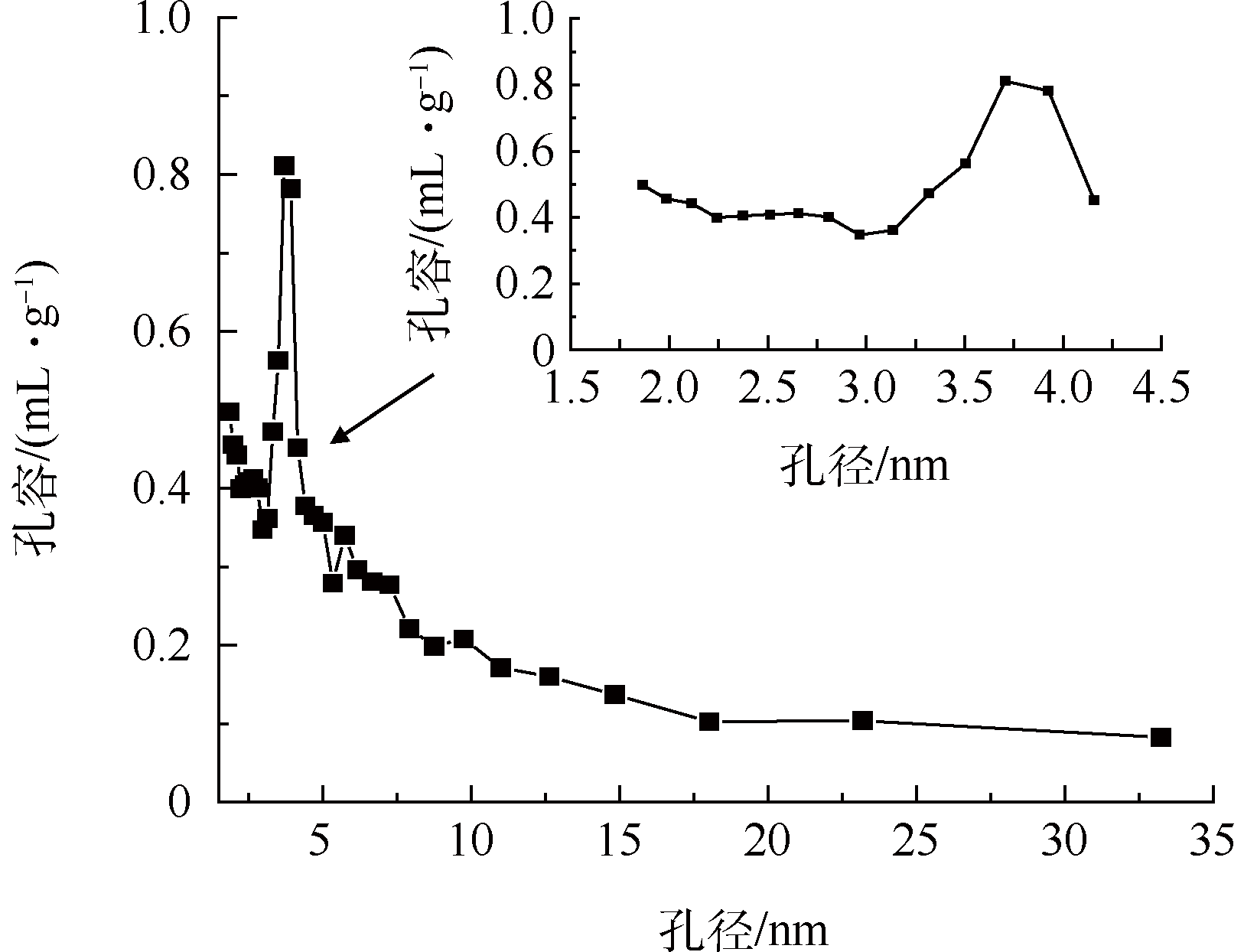 有機物組分檢測發現,活性焦出水中含有8種有機物,比組合工藝進水減少了13種(表2),出水中主要為長鏈烷烴和醇類,占總有機物總量46.53%,原水中難生物降解的大分子苯環類物質均被去除。對比多級AO出水和活性焦濾池出水中有機物組分發現,經過活性焦吸附和截留,芳香族類、環烷烴類、鹵代烴類有機物比例由50.23%降至10.24%,其原因為吸附劑的吸附容量大小與其孔結構密切相關,通常需要吸附劑孔徑與和吸附質分子大小相互匹配,檢測活性焦表面物理性質,其孔徑分布如圖8所示,在大于2 nm的中孔范圍內有峰值出現,其孔徑的峰值出現在3.5~4.0 nm之間。有研究發現,活性焦的吸附過程中,表面中孔對大分子有機物的吸附發揮著重要作用。中孔結構可以有效吸附去除多級A/O出水中難生物降解的殘留有機物,特別是大分子結構復雜的芳香族類和環烷烴類有機物,因此活性焦濾池可以有效降低系統出水COD濃度。靳昕等將活性焦濾池應用于污水處理廠二級出水,發現可以保證出水COD穩定在50 mg·L−1以內,可見活性焦對于生物處理尾水中殘留有機物具有良好處理效果,能保證系統出水的安全性,避免對受納水體生物產生毒害。