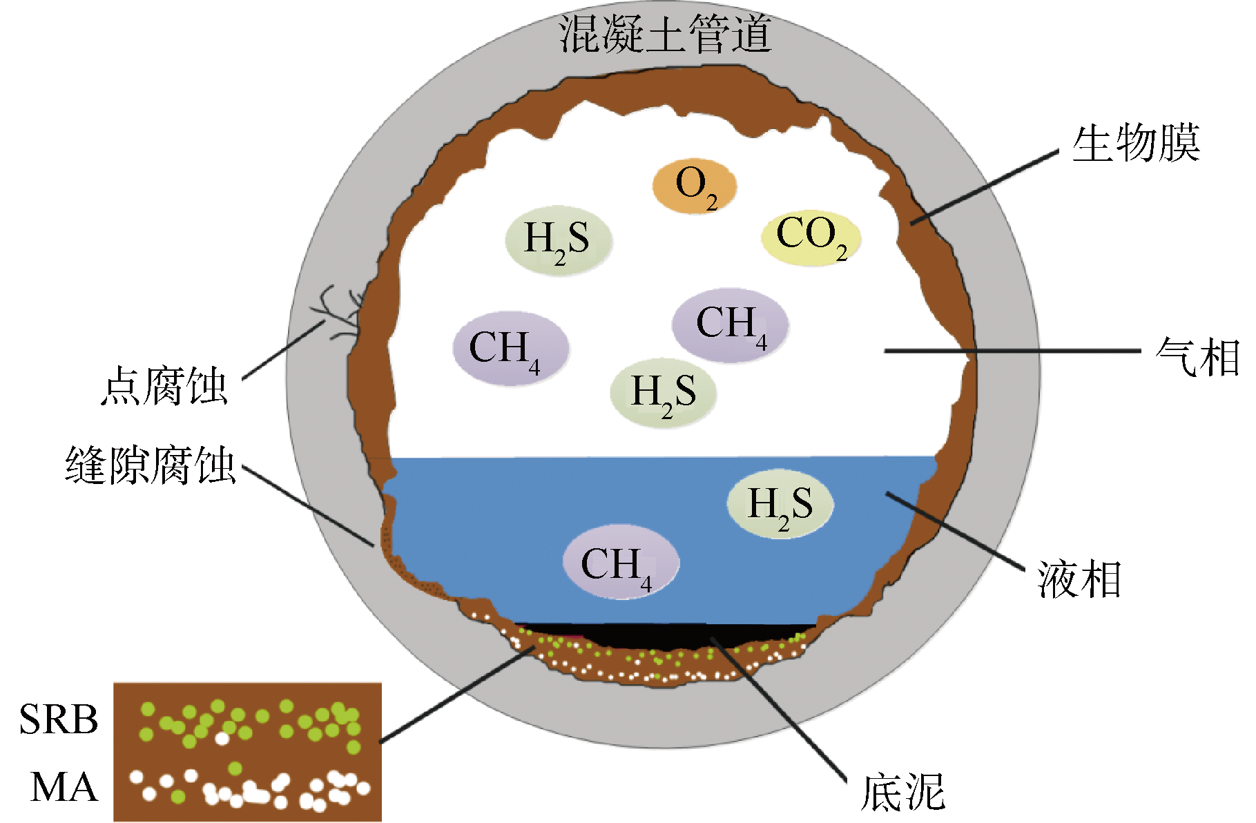 城市排水管道中的污水以生活污水為主,含有豐富的碳、氮、磷等營養物質,且管道內部為密閉空間,為厭氧菌的生長提供了有利條件。實際管道生物膜中的細菌以擬桿菌綱、β-變形菌綱、δ-變形菌綱為主,古菌則以甲烷鬃毛狀菌科、甲烷球菌科為主。SRB還原硫酸鹽所產生的H2S是管道腐蝕的主要原因,同時,研究表明,污水在管道輸送途中削減了大量sCOD,其中72%的削減量來自于產甲烷過程。因此,SRB和MA是管道中的2種關鍵菌群,實際管道中液相CH4、H2S濃度可達30 mg·L−1、12 mg·L−1 。目前,國內排水管道的材質多為混凝土,管道內壁粗糙不平、比表面積較大,雖然水泥的水化過程產生了較高的堿度,但H2S的積累逐漸降低了液相pH,同時腐蝕管道表面,使微生物能夠不斷侵入管壁內部,進一步加劇管道結構破損(見圖1)。