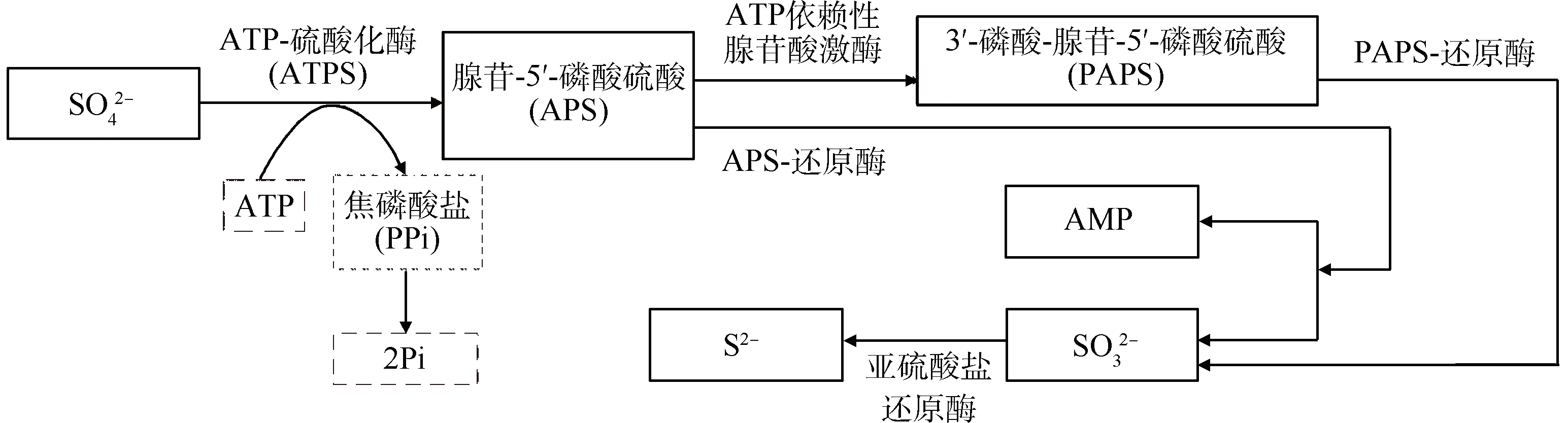 硫酸鹽的還原途徑如圖2所示,SO42−/SO32−本身氧化還原電位過低,SO42−須被激活成強氧化劑APS,之后再還原為S2−。污水中的有機碳源被降解時所產生的ATP和高能電子在這一途徑中被利用。某些SRB還可以利用硝酸鹽作為唯一氮源,進行同化代謝。